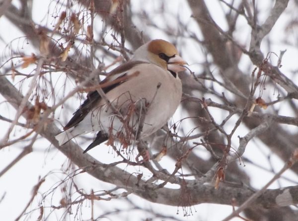 23, 10:00 am - Snowshoeing at Midorigaoka Park in Kitami The day before we enjoyed the Bird Seminar (on bird calls and recording techniques) and today we enjoyed a birdwatching event led by yesterday's instructor, Mr. Hanada. He showed us how to use bird calling tools such as one he had made from an apricot seed. There were very few birds around at first, but during the second half of the walk, a Marsh Tit responded to Mr. Hanada's call. Someone tried making calls from a tool he had made from a plum pit, but it didn't work very well. The flatter apricot seed seems better suited. I'd like to try making a ceramic one. (Gerazou is a potter.) The one made of metal was also good. The length on this one was adjustable and could be used to make calls for different birds such as Hazel Grouse or tits. At the end of the trail was a greenhouse with tropical and subtropical plants where we could warm up before heading home. [from report by Gerazou] |