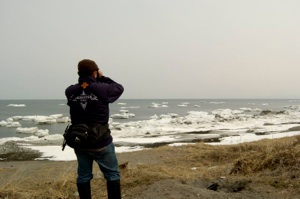 It is now a couple of years later, during the coastal survey in April 2008. Birds in the area are first counted and recorded. The birds are also checked for any contamination. (Hama Koshimizu, 8 April 2008) |